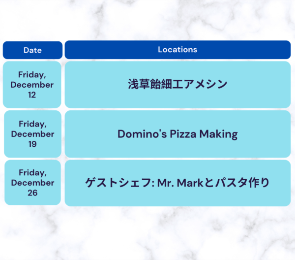 - Yoyogi Campus ※Week 3 (12月22日~26日)のみ