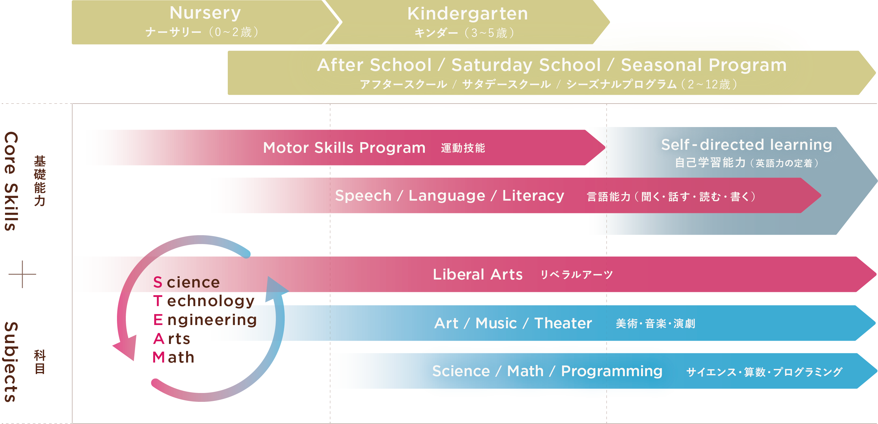 アートとは、絵を描くことや音楽を嗜むことに限らず、社会性、人間力、コミュニーケーションなども含む広義のLiberal Arts(教養教育)を指しています。そこにScienceが加わり、これからの時代に必ず必要となる算数やプログラミングを含むSTEM※の科目を学んでいきます。