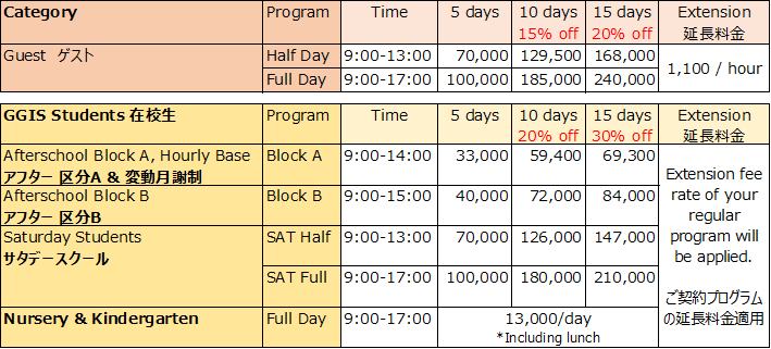*Additional 5,000yen / week for lunch fee. *Including Afternoon snack. Students may bring their own snacks but the fee will not change. Please do not bring snacks with nuts in it. *Lunch is included in the Nursery & Kindergarten participation fee.