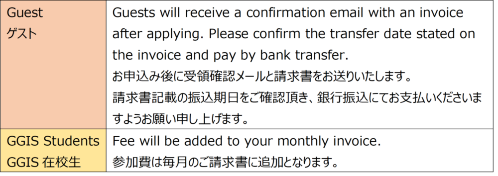 Once you have paid your participation fee, it cannot be refunded. - Guest students will receive an invoice after your application is accepted. GGIS students will be charged on the following month’s invoice.