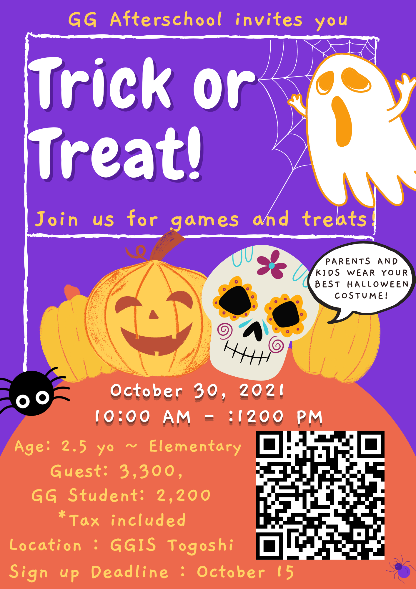 - Parents are free of charge (Please wear a costume, too. There will be a costume competition for parents!).