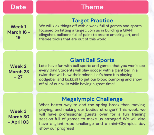“This Spring, we will go BIG! Join us for 3 weeks of MEGA action and sports! We will build giant slingshots, play supersized soccer, and have professionals help us get stronger!”